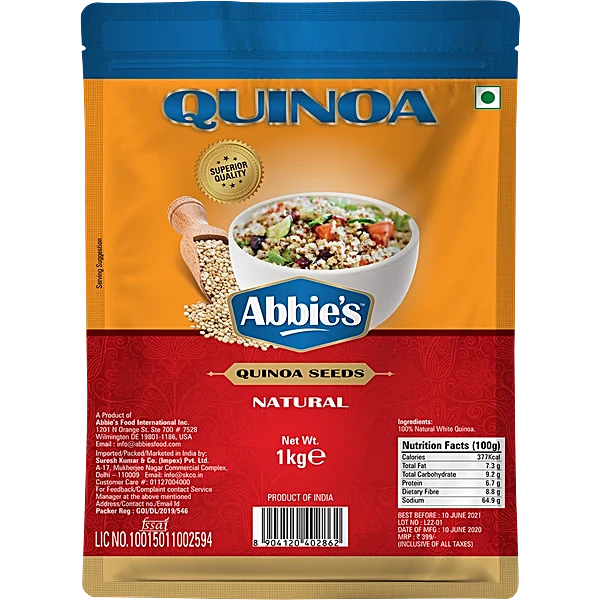 Quinoa is a Superfood jammed with many nutrients. It can be replaced with white rice for people who are on a strict diet. It is an ancient food, comprised of all essential nutrients and is healthy for any person. Abbie’s Quinoa is naturally gluten-free, composed of a mixture of vitamins, minerals and nutrients, required by the body for carrying out the overall functioning of the human body. It is power-packed with protein and is a fantastic wheat-free alternative, providing all the nine essential amino acids. The gluten-free property of quinoa makes it more healthy, beneficial in certain disorders of the body and keeping you healthy throughout. Gluten-free Superfood: Quinoa, being gluten-free in nature, it is said that this leads to an increase in the nutrient and antioxidant value of your diet. Helpful in weight management. It has a mild and slightly nutty flavor and a fluffy texture that is somewhat chewy. It also tastes similar to brown rice but has a nuttier earthy flavor. It is vegan and 100% natural. Weight : 1 kg Store in a cool, dry place