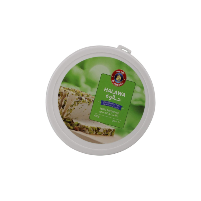 Al Ameera Halawa with Pistachio Flavour : Pistachio Brand : Al Ameera Weight :0.4 Kilograms Package Information : Tub Speciality:Vegetarian Package Weight : 0.42 Kilograms Units:400 gram Pack of 1 x 700g Ingredients :Roasted Sesame Seed, Pistachio, Sugar, Glucose, Citric Acid, Emulsifier (Monoglyceride from Vegetable Origin), Soapwort Extract, Vanilla.