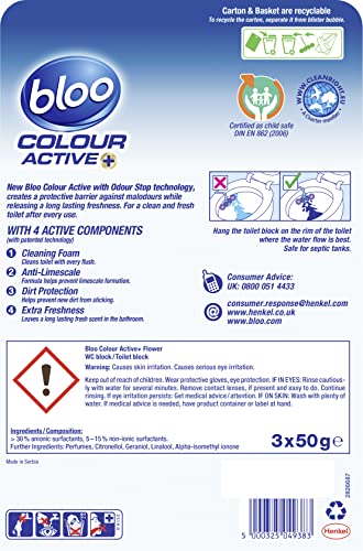 Bloo Solid Toilet Rim Block Colour Active Blue Fresh Flower | 4 in 1 Toilet Cleaners with Anti-Limescale, Cleaning Foam, Dirt Protection and Extra Freshness | Pack of 3, 3x50g