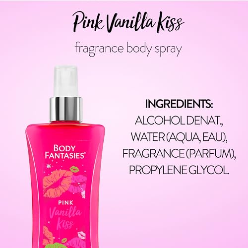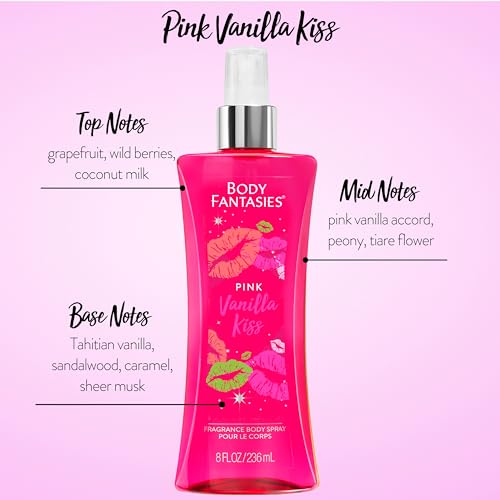 • Body Fantasies Pink Vanilla Kiss Body Spray is a truly scrumptious fragrance that smells like your favourite carnival treat.