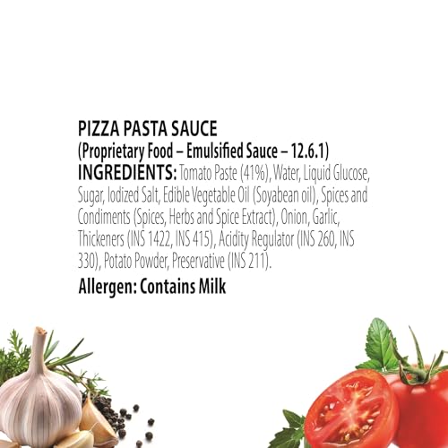• Material Features: Vegetarian ; Item Form: Paste ; Ingredients: Tomato Paste (41%), Water, Onions, Liquid Glucose, Sugar, Edible Vegetable Oil, Iodized Salt, Spices & Condiments {Garlic Powder (0.97%), Mixed Spices, Red Chilli Flakes (0.25%) & Red Paprika (0.19%)}, Acidity Regulators (Ins 260, Ins 330), Milk Solids, Thickeners (Ins 1422, Ins 415) And Preservative (Ins 211)