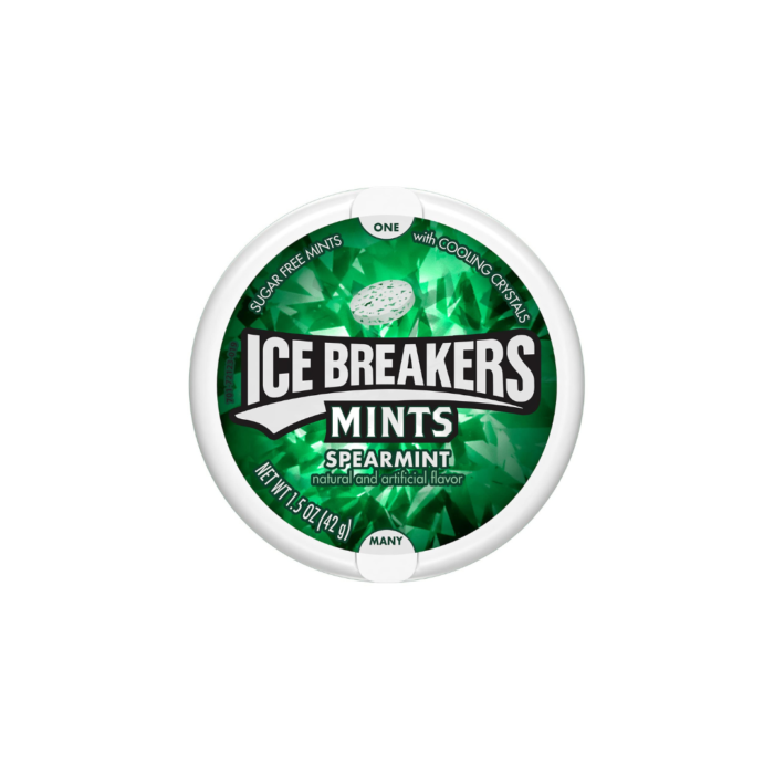 Refresh your breath with the cooling crystals in these mints that will give you a fresh breath instantly. The container it is packaged in is easy to carry on-the-go and can be favoured whenever needed. Ice Breakers, Spearmint Sugar Free Mints, 1.5 Oz: You?ll want to take these refreshing mints everywhere Keep them in your pocket or purse, kitchen drawer, car, and at your desk Spearmint flavor Sugar free mints We aim to show you accurate product information. Manufacturers, suppliers and others provide what you see here, and we have not verified it. See our disclaimer Specifications Brand Icebreaker Country of origin: USA INGREDIENTS ?Sorbitol, Maltitol, Maltodextrin, Contains 2% or Less of: Natural Flavor and Artificial Flavor, Gum Acacia, Aspartame (Phenylketonurics: Contains Phenylalanine), Magnesium Stearate, Citric Acid, Lecithin (Soy), Artificial Color .