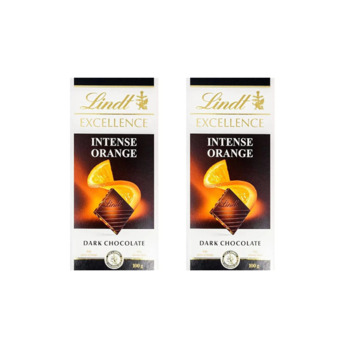 The luxurious taste of Lindt Excellence Orange Intense Dark Chocolate this premium dark chocolate combines the rich, smooth texture of Lindt dark chocolate with a zesty infusion of orange flavor, offering a uniquely satisfying treat. The pack of 2 contains 100g bars, perfect for those who love the bold contrast of citrus and cocoa.