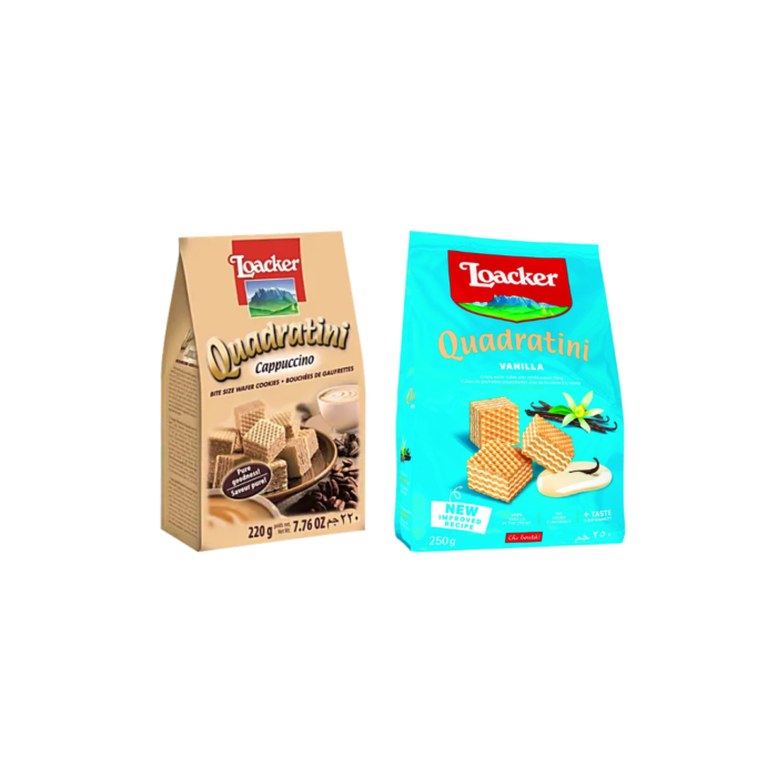 Indulge in the perfect coffee-inspired snack with the Loacker Quadratini Cappuccino Wafers 220g and Loacker Quadratini Vanilla Wafers 250g Combo Pack. These premium Italian wafers combine crispy, light layers with rich, velvety fillings. The Cappuccino flavor is infused with the aromatic essence of fresh coffee, while the Vanilla flavor offers a smooth, creamy taste. This combo pack is ideal for those who enjoy a sophisticated snack during their coffee breaks or as a delightful treat after meals.