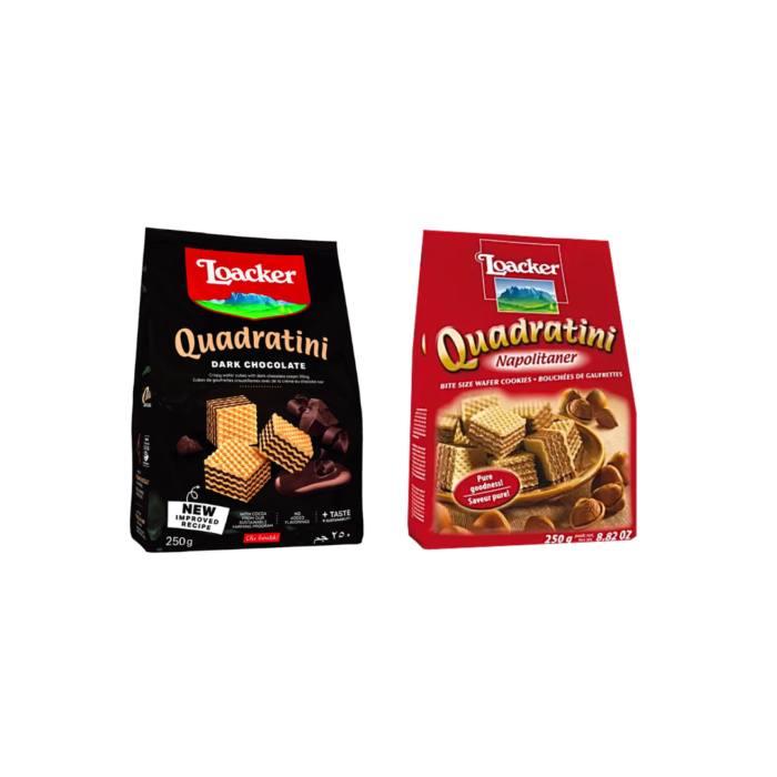 Indulge in the irresistible combination of Loacker Quadratini Dark Chocolate and Loacker Quadratini Napolitaner Wafers in this perfect 250g combo pack. Made with high-quality ingredients, these premium wafer snacks deliver a satisfying crunch and rich flavor, making them ideal for any occasion.