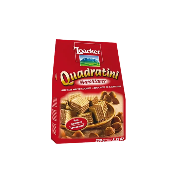 Indulge in the layered goodness of Loacker Quadratini, a perfect blend of crispy wafers and creamy hazelnut filling for an unmatched taste experience.