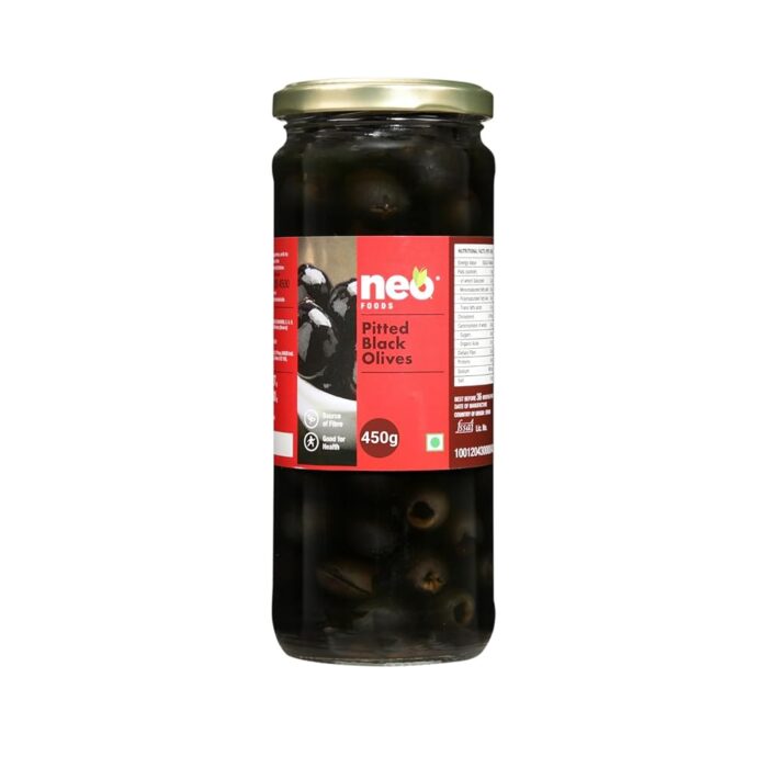 Neo Pitted Black Olives 450g l 1 Jar l Low Fat Ready-to-Eat Healthy Snack, Source of Fibre l Enjoy as Topping for Pizza & Pasta l 450g