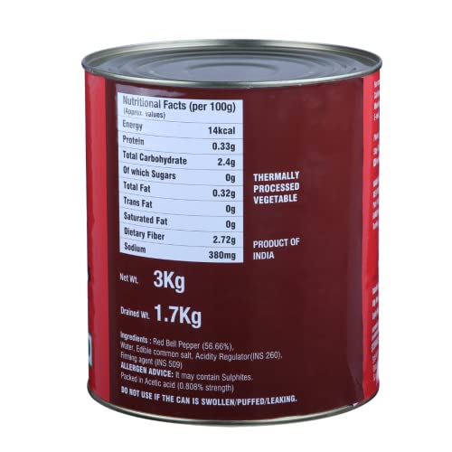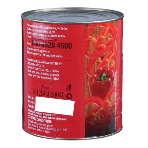 Neo Sliced Red Capsicum 3kg Tin I Red Bell Pepper I Ready-to-Eat Fibre-Rich Topping for Snacks and Salads I Enjoy as topping for Pizza, Salad, Burger and Sandwich