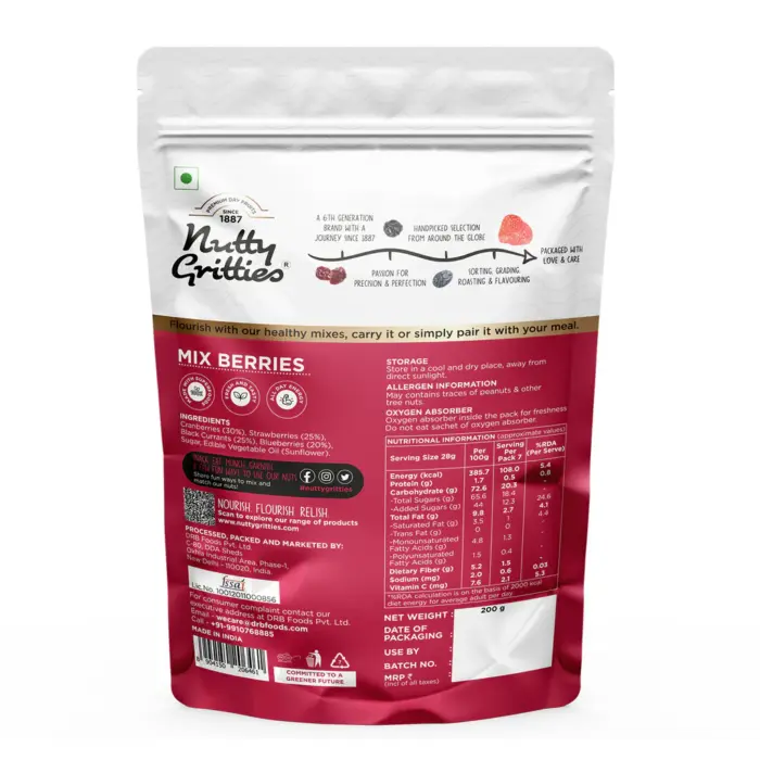 • HIGH IN DIETARY FIBRE- 50g in 100g Mix Berries. Helps to maintain a healthy digestive system by promoting regular bowel movements.