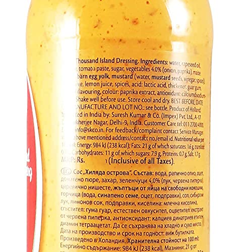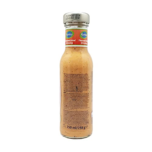 Add a dash of taste to your salads with the Remia fine thousand island salad dressing made from finely chopped ingredients. This creamy dressing, with mayonnaise and herbs enhances great taste and comes in a glass Bottle for easy storage too.