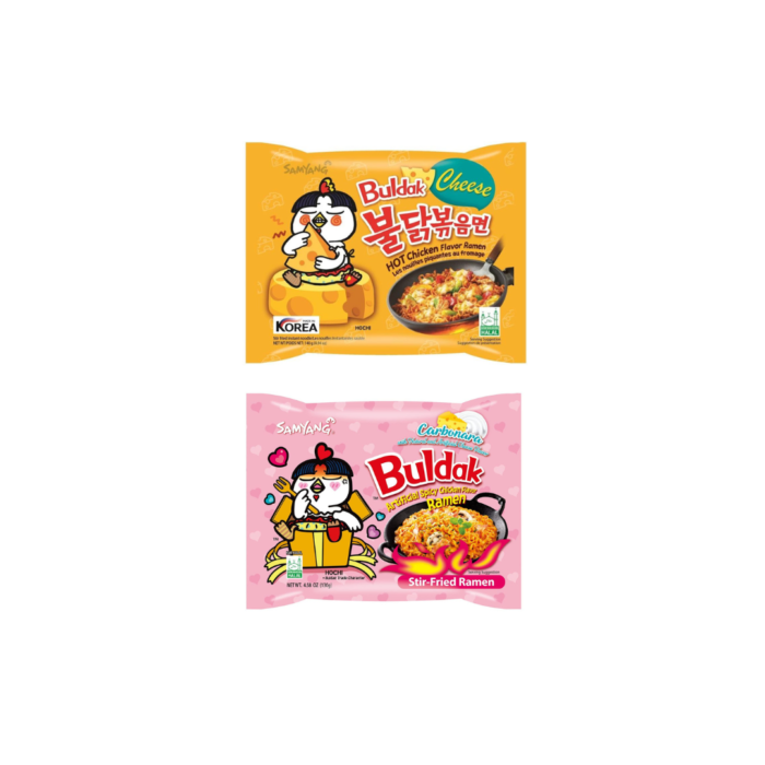 The creamy cheese flavor of Samyang carbonara ramen contrasts with the fiery spice of Buldak fire chicken cheese noodles.