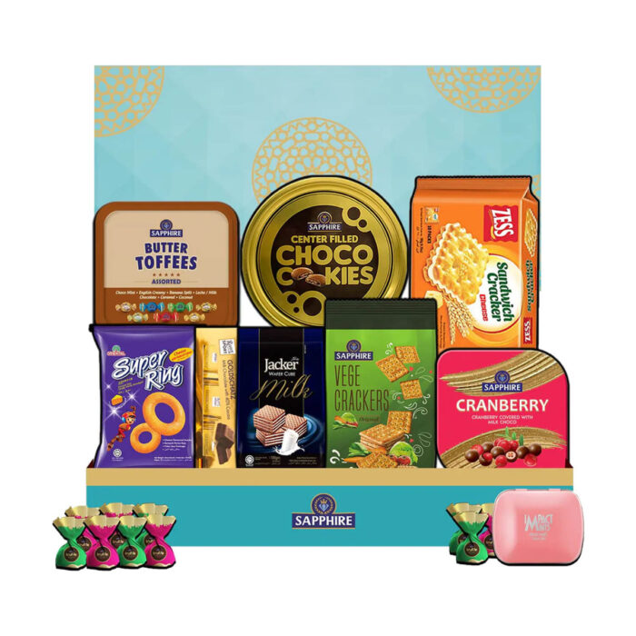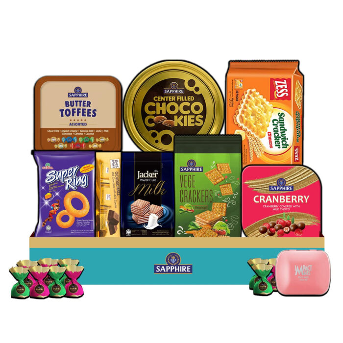 Enjoy the best of the best in this Sapphire Gift Hampers Snakcs Box. The box consists of – Sapphire Choco-filled Cookies, Impact Mints Sugarfree Peach Mints, Sapphire Chocolate Coated Cranberries, Oriental Super RInges (cheese flavor), Jacker Wafer Cubes Milk Flavor, Sapphire Butter Toffees in Assorted Flavors, Sapphire Vege Crackers, Ritter Sport Minis, Zess Cheese Sandwich Crackers, Sapphire Truffle Selection.