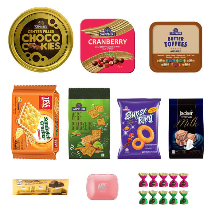 1) Sapphire Choco-filled Cookies 350g 2) Impact Mints Peach 14gm 3) Sapphire Coated Nuts Cranberry 4) Oriental Super Rings 60g 5) Jacker Wafer Cube Milk 100g 6) Sapphire Butter Toffee 550g Assorted 7) Sapphire Vege Crackers 350g 8) Ritter Sport Minis Goldschatz 150g 9) Zess Cheese Sandwich Crackers 180g 10) Sapphire Truffle Section 10 p/c