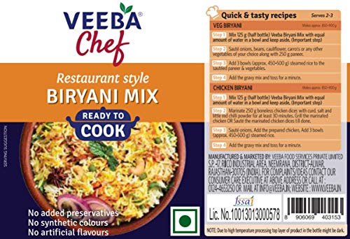 • Veeba Chef Biryani Mix is a perfect blend of spices to give you the most relishing restaurant style biryani in the comfort of your home.