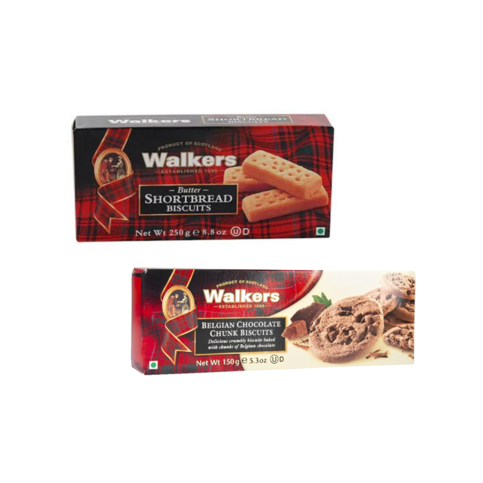 The luxurious combination of Walkers Shortbread Biscuits Fingers and Walkers Belgian Chocolate Chunk Biscuits with this delightful combo pack. The classic Walkers Shortbread Fingers, made with the finest ingredients like wheat flour, butter, and sugar, offer a rich, buttery taste and crumbly texture. Paired with the deliciously decadent Walkers Belgian Chocolate Chunk Biscuits, crafted with Belgian chocolate chunks, this combo brings a perfect balance of smooth chocolate and crumbly shortbread.